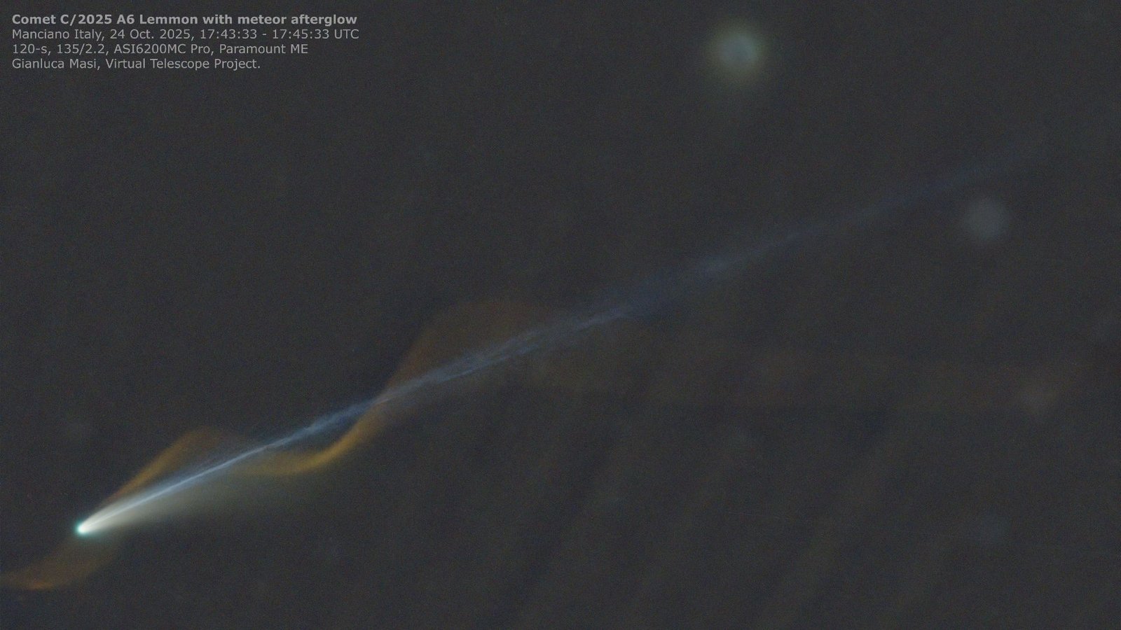 Spectacular Capture: Astronomer Gianluca Masi photographed a meteor trail intertwining with Comet Lemmon’s tail on Oct. 24, showcasing a glowing wave effect in the atmosphere.