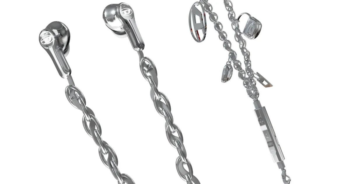 1. Vintage Aesthetic: Diesel’s new 60458 wired earbuds embody early-2000s fashion, featuring a metallic chain design reminiscent of wallet chains popular in denim culture.